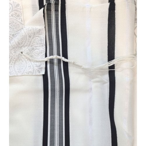 Tallit mit schwarzen und silbernen Streifen und eingewobenen Segenssprüchen.
