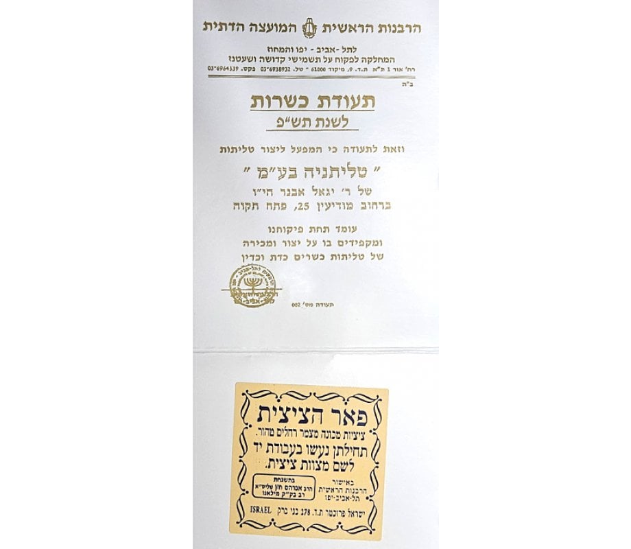 Mit aufwändig gearbeitetem Band, das am oberen Ende des Gebetsschals mit Krone und Segenssprüche eingestickt ist.