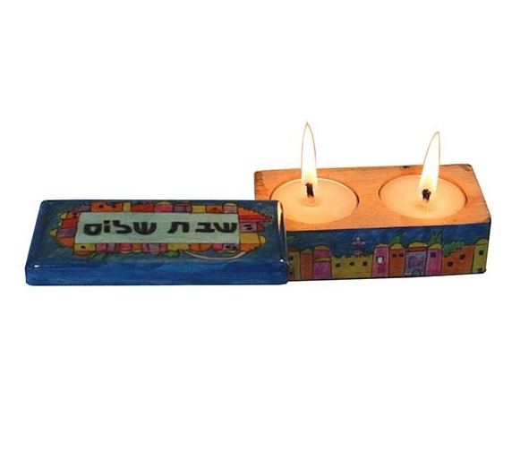 Dieser farbenfrohe Reisekerzenhalter ist ein Unikat aus der Werkstatt von Emanuel. Inschrift: "Schabbat Schalom".