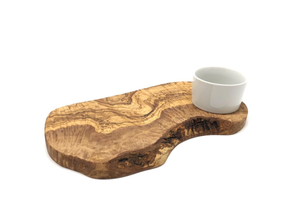 Schneide- und Servierbrett aus Olivenholz inkl. Dipschale aus Porzellan.