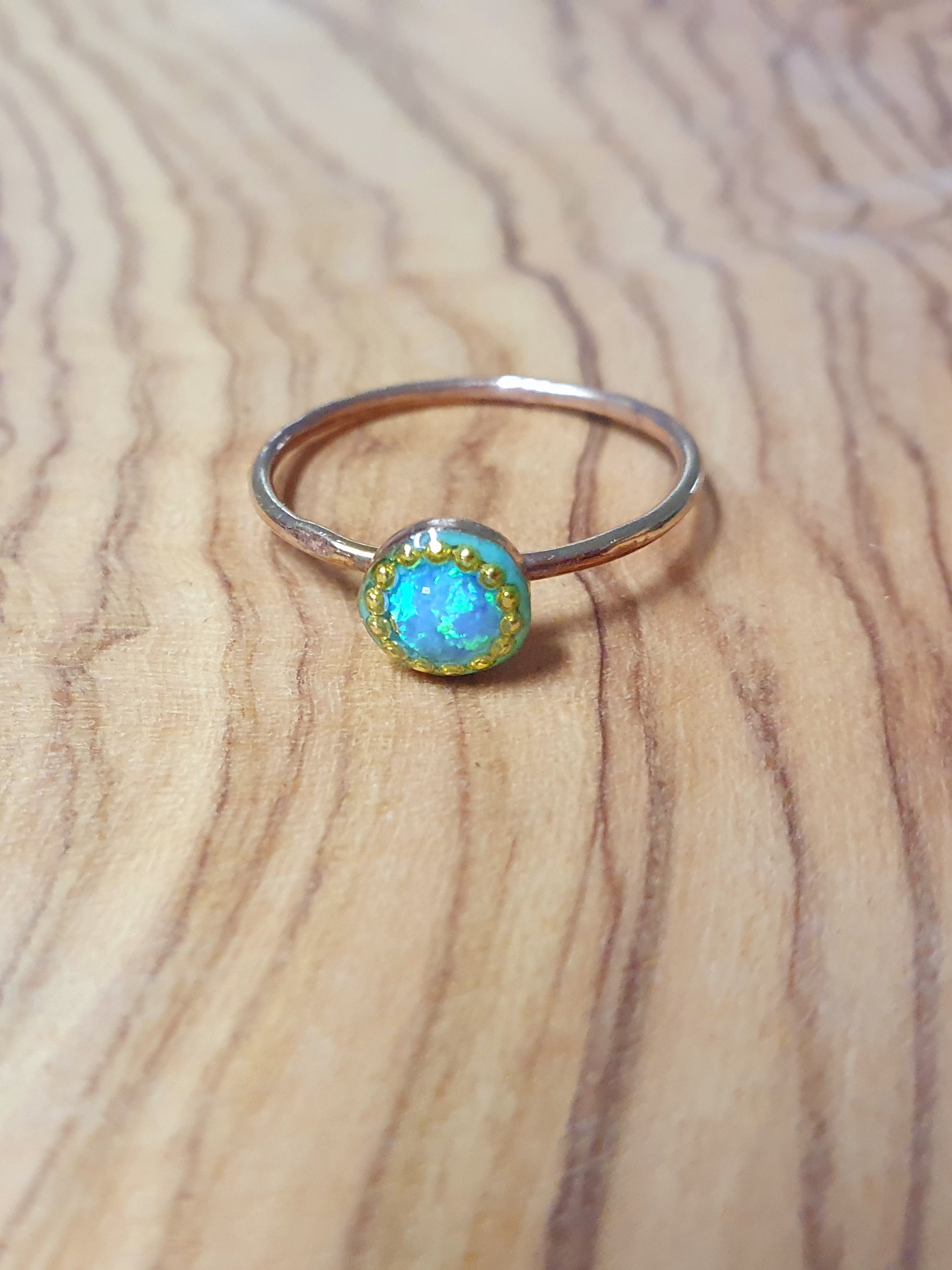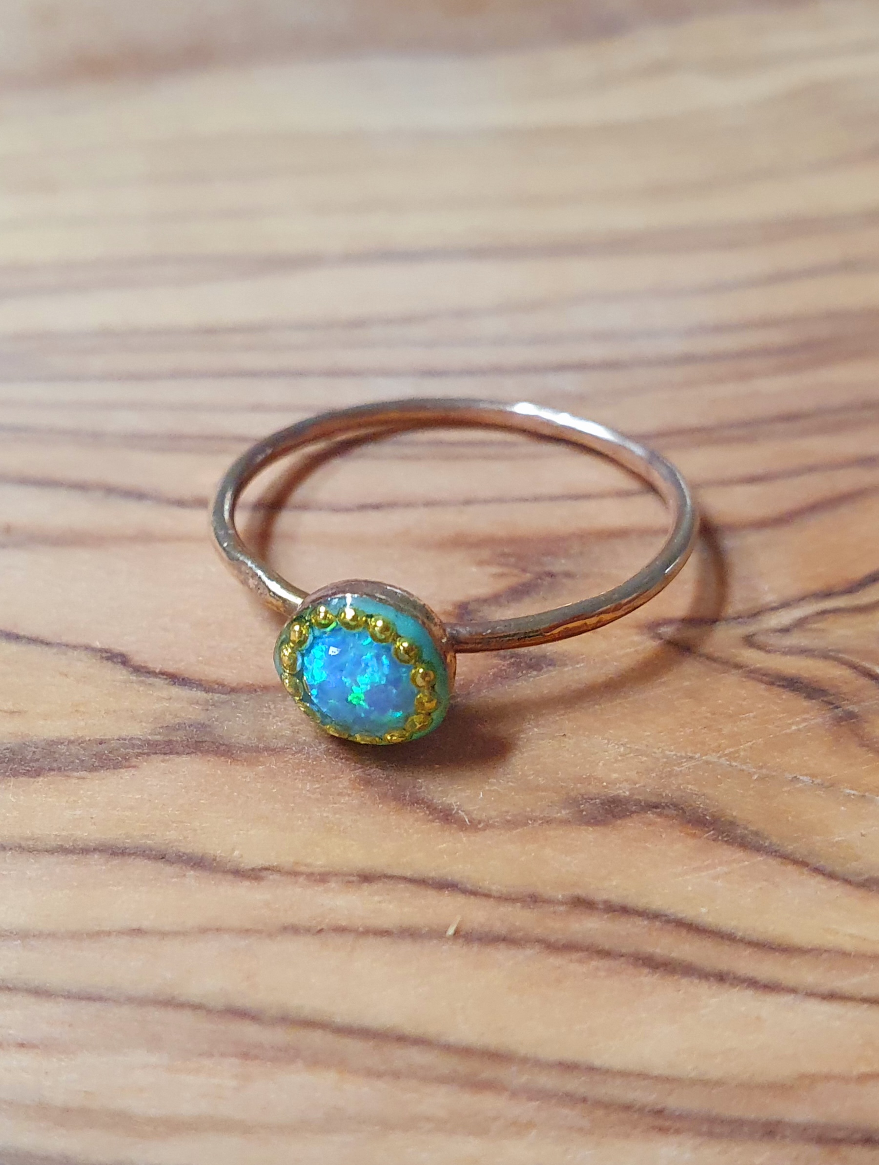 Dieser zierliche Ring ist Hila Welner Original-Design. Aus Gold gefüllt, mit Harz veredelt und mit einem blauen Opalstein eingelegt. Dieser Opal-Ring hat ein zeitloses Design, Sie werden es für immer schätzen!